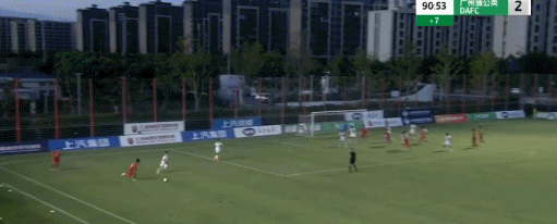 第90+1分钟,张慧宇禁区内折射破门,上海海港B队2-2广州蒲公英
